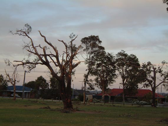 I believe the damage to the trees in the Reserve indicates tornadic damage consistent with a weak F1 tornado. My main reason for this is that the Morten Bay Fig trees have a large foliage area (surface area) in which the wind can catch and hence the force on the trunk would be large enough to snap the trunk. One of the large Morten Bay Figs is still standing and it took a direct hit by the tornado. The other reason of course is that damage to houses was minimal.