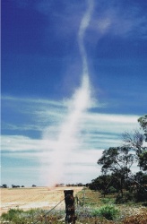 The second day I went out was a bit warmer (30C), and when I drove out of town I saw 3 of them. I couldn't get close to them but things were looking up. I set up the cameras looking into a dusty field and waited for them to develop. I got a few photos and video of some, but it was a long wait between them, and there very bad definition (not much dust). I drove back towards town and I could see quite an active area of DD's so I headed bush. I had to drive quite fast to try and get close to them but once again was thwarted in that they were over by the time I got near them. I then had a stroke of luck and one started developing within 2 kms of me so I jumped in the car and howled off in a trail of dust (well it was a dirt road after all, heehee). As I pulled up next to the paddock it was just starting to really get going and it was the one I was after. Large, high definition...Excellent. My heart was beating fast as I grabbed my tripod and camera from the back seat and legged it up an embankment. I set up the tripod in a panic (you've got to be quick) and was all thumbs. It took me what seemed ages to get it set up and the video camera going. I could see the DD wasn't going to last long so I was in a hurry. Basically to cut a long story short, I stuffed it up. The tripod swivels were done too tight, and every time I tried to point the camera in a direction it didn't stay there, so I ended up fighting with the tripod and the picture ended jerking all over the place. You get dizzy watching it. I really only got 2 seconds of good still footage. You can still see how awesome the dust devil was (was only good for 13 seconds as it went behind trees), but I was really disappointed. I got a few more DD's from a long way away and headed home.